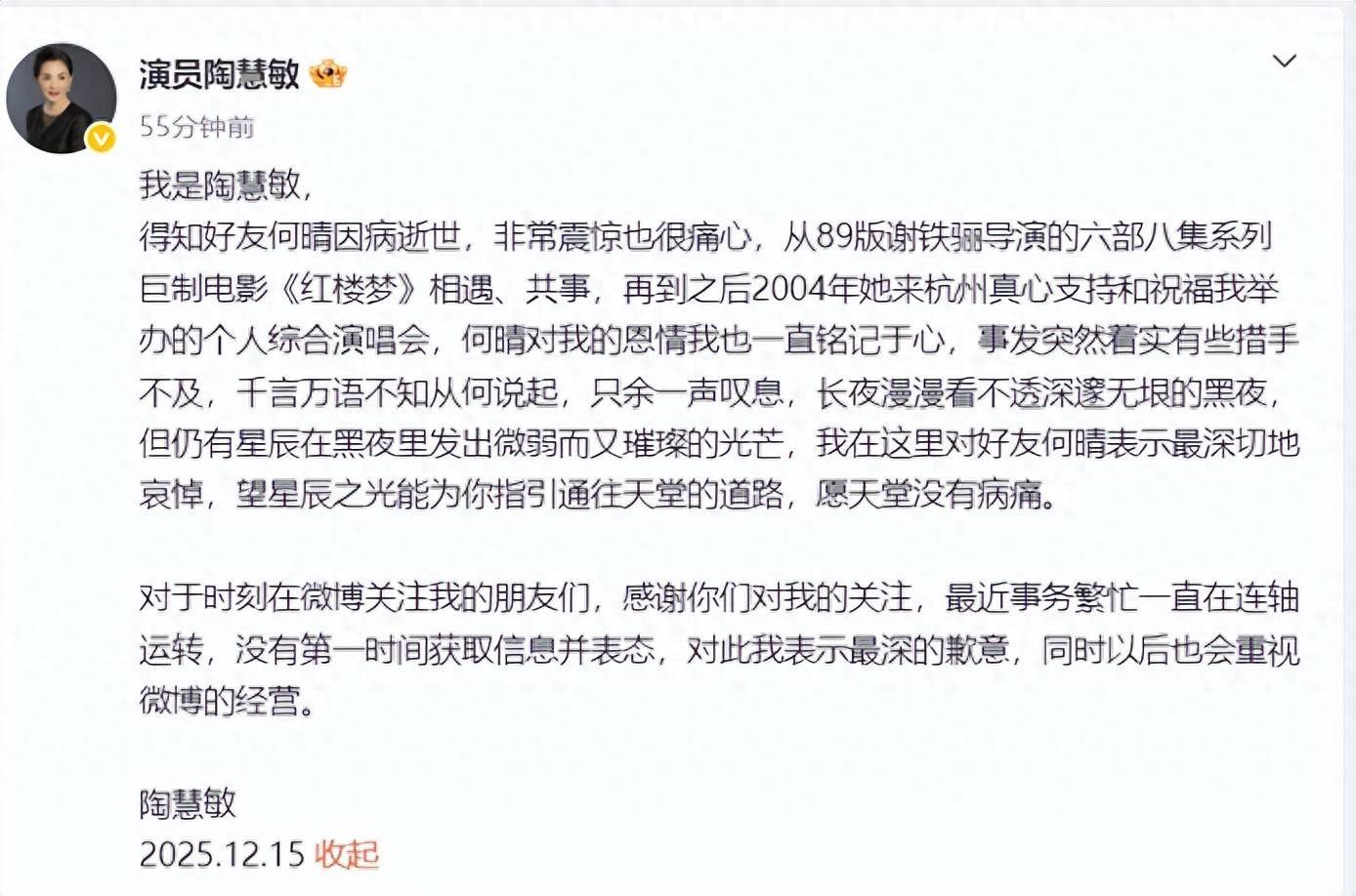 12月15日,演员陶慧敏在社交媒体平台发文悼念何晴,她表示“从89版谢铁骊导演的六部八集系列巨制电影《红楼梦》相遇、共事,再到之后2004年她来杭州真心支持和祝福我举办的个人综合演唱会,何晴对我的恩情我也一直铭记于心,事发突然着实有些措手不及,千言万语不知从何说起,只余一声叹息..."