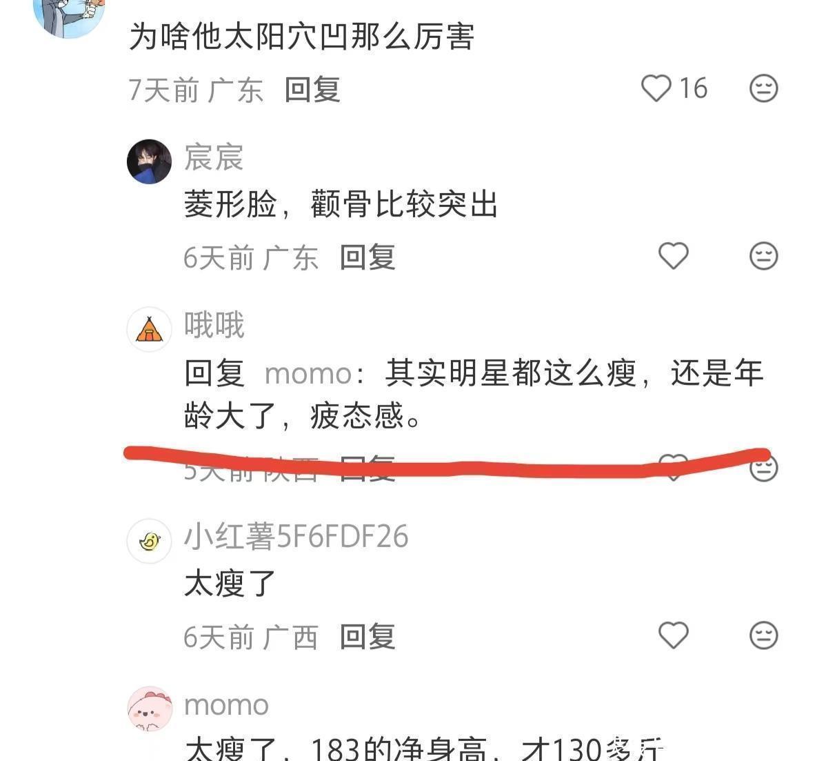 他的太阳穴凹陷得太明显了颧骨在对比下显得格外突出整张脸变成了标准的菱形有人提到他身高183体重却只有130多斤这个数字在普通人里算很瘦了但在明星群体里却司空见惯不对,应该说这是他们的常态镜头会让人显胖这个说法我始终持保留态度毕竟现实中见到这样的身形第一反应都是该补充营养了演艺圈对体重的执念早就超出了健康范畴变成某种行业标准就像后厨对食材的克重要求他们不是在减肥是在执行某种身体管理程序183的身高配130斤的体重让我想起学生时代晾在阳台的白衬衫风一吹就晃个不停这种体型放在普通人身上周围人早就催着多吃点了但在那个行业里反而成了理所当然或许我们该重新思考什么才是正常的身体标准