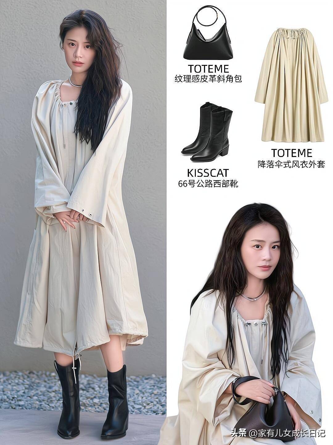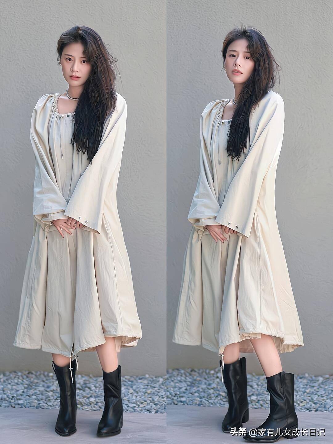 先说那套米色风衣裙配西部靴,简直是“文艺少女教科书”!风衣选的是带点褶皱感的面料,长度到小腿中间,走路时裙摆轻轻晃,像被秋风拂过的落叶,温柔得能掐出水。她没系腰带,就让衣服自然垂着,慵懒又不拖沓,里面搭了件浅咖色针织衫,领口露出一小圈,显得脖子细细的,超有气质。最绝的是那双西部靴——棕色牛皮材质,鞋头有点圆钝,靴筒刚好卡在小腿最细的地方,她穿了双肉色打底袜,靴子一蹬,小腿瞬间瘦了两圈,我158的闺蜜试了同款搭配,都说“第一次觉得自己腿这么直”。