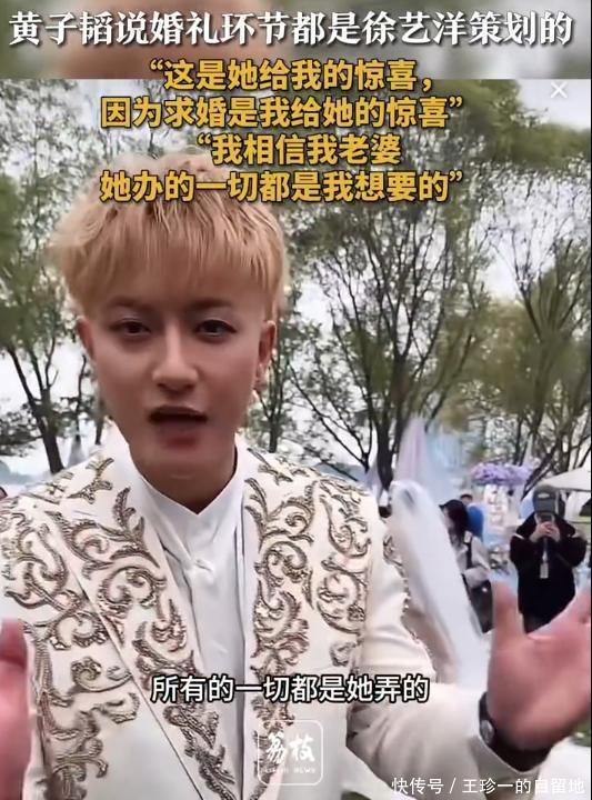 在婚礼正式开始之前,黄子韬就在直播中骄傲地说婚礼的所有环节都是徐艺洋策划的。他说“这是她给我的惊喜,因为求婚是我给她的惊喜”。
