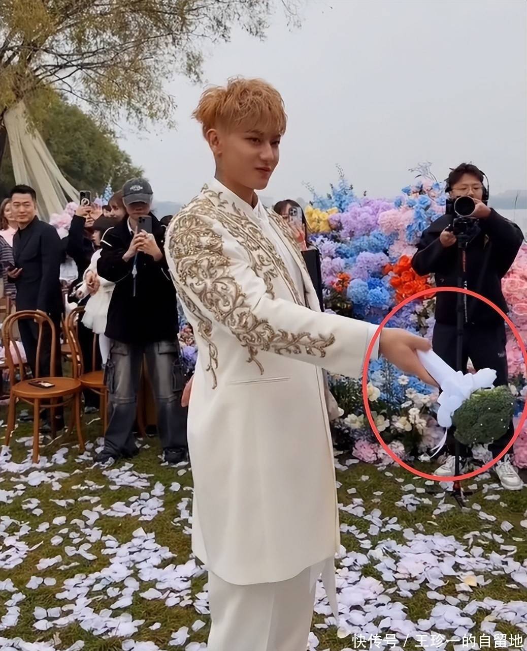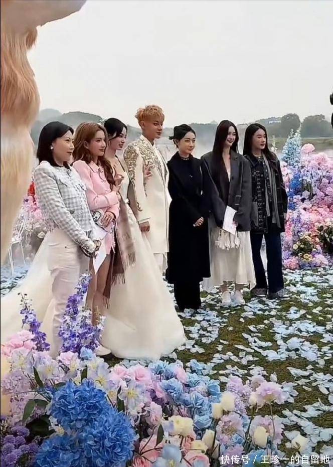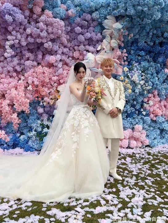 从直播中可以看到,整个婚礼放在了户外,婚礼现场花团锦簇,布置得很梦幻。